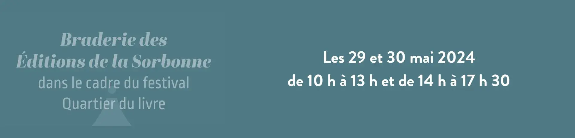 Dans le cadre du festival Quartier du livre du 5e arrondissement, les Éditions de la Sorbonne ont le plaisir de vous proposer une braderie exceptionnelle de leurs ouvrages, disponibles à la librairie du 212, rue Saint-Jacques (Paris 5e), du 29 au 30 mai, de 10 h à 13 h et de 14 h à 17 h 30.